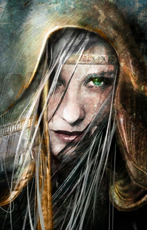 something a little different. basically, i did this because i wanted a portrait to go with a white-haired female character. she could be any magic-using class. backround and hood are intended to blend together. SOURCES: model photo base and the arm cuff of a clerical robe....not much else...mostly a 'paint-over'. comments and critiques are welcome.
