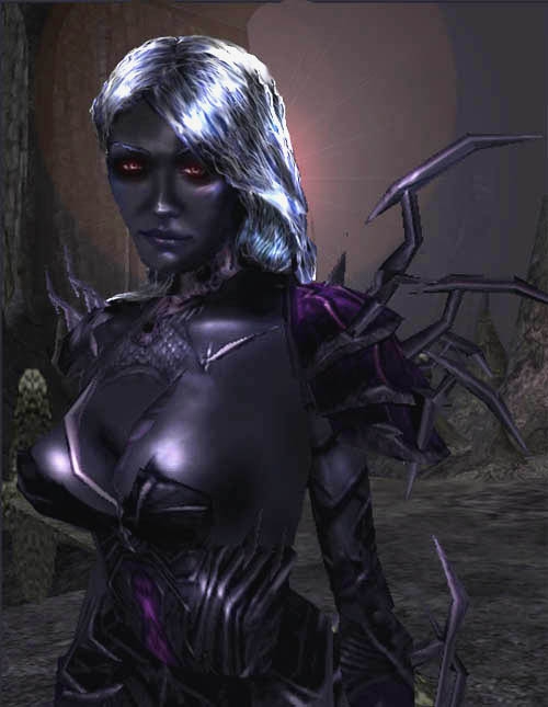 I tried something different. Using another portrait (zesstra) and combined it with the body of the Valsharess, and added another screenshot as background. Then painted and relighted the whole thing. 06-02-2004 I made the portrait a little lighter, and changed the name, it's Dhaunae not Dhanae, typing error.