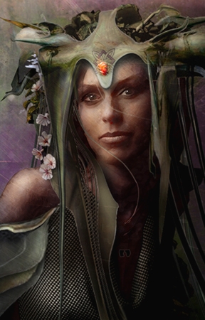 middle-aged Morrigan. 2nd in the series of three. Her embodiment as 'Mother'. SOURCES: blend of Daisy Fuentes and a sears catalogue model. the headdress is made from various plant life and a riding saddle. enjoy.