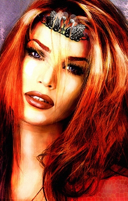 This was a request for one of my friends :) This was her description of her: 'Her hair is red, as dancing flames. Her eyes are blue, and her clothes are red. Her lips are the color of blood. She travels with good adventurers, waiting for her chance to prey on their weakness, and sacrifice them for her evil deity. Very very beautiful, with no obvius clues to her foul personality. On her head she wears a headress with swans'. Please, dont bother telling me she have too much makeup on her. I already know this, but thats how the character is. I hope someone find it useable ;)