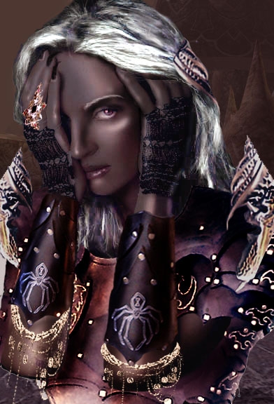 Another plot-character in my Underdark module. She can be used as a drider, but also a drow female. Photo-collage with Uma Thurman as main model, and various pieces of armour and knives and weapons used for clothing and jewels. Update: changed the background. It somehow bothered me and was too chaotic for the many details of the character. Update 2: I've added another version in the zip-file without the face-piece, (see larger picture) so both are available in the game.