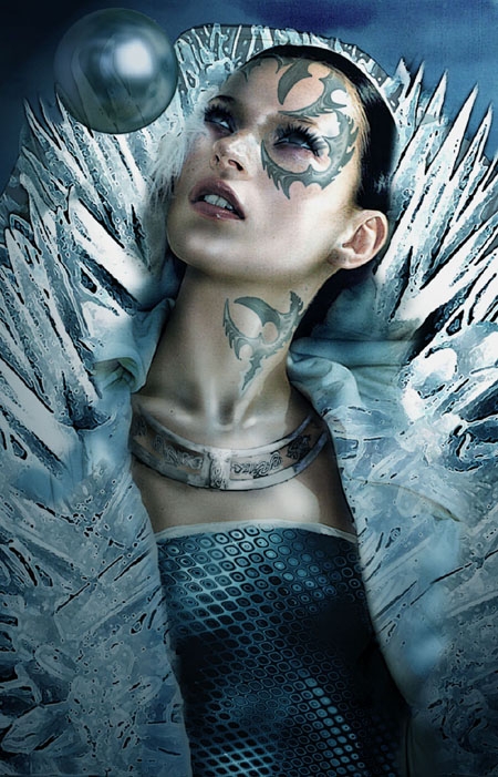 The Goddes Titania is the goddes of metal. In this portrait she observes the planet Themish with interest. Titania was created from the base image of Kate Moss, added a lot of textures, relighted, recoloured, added other elements such as clothing and stuff.