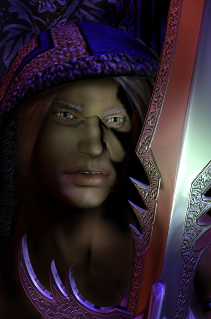 ...nother Poser character. Could be a rogue, assassin, fighter... what have you. Had fun playing with the shadows from and the reflections on the sword. There is a good bit of post work on the face and deepening the shadows, etc. Let me know what you think...