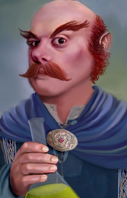 I tried to make a portrait that more resembeled bioware's own portraits this time. The base was an actor made up as Santa's helper, but the photo has been heavily modified. He had a huge beard which I got rid of and repainted his face an moustache. Did some adjustments to eye and eyebrows, re-painted the hair, painted a cloak, added brooch and tunic, hand and the beaker. Finished it all off by airbrushing/smudging the whole portrait. No effects/blends or anything added. This is just a merge and airbrush thing. Hope you like. ***UPDATED*** Someone mentioned it was slightly blurry, and it was. My eyes were rather tired last night so I didn't even see it, heh. (I may also have saved the targas in PS CS too, I normally do that in Paintshop as I'm not sure if CS do it right. They'r re-saved in Paintshop now anyways so they're allright :)