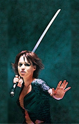 Woman with a sword, in a defensive stance.