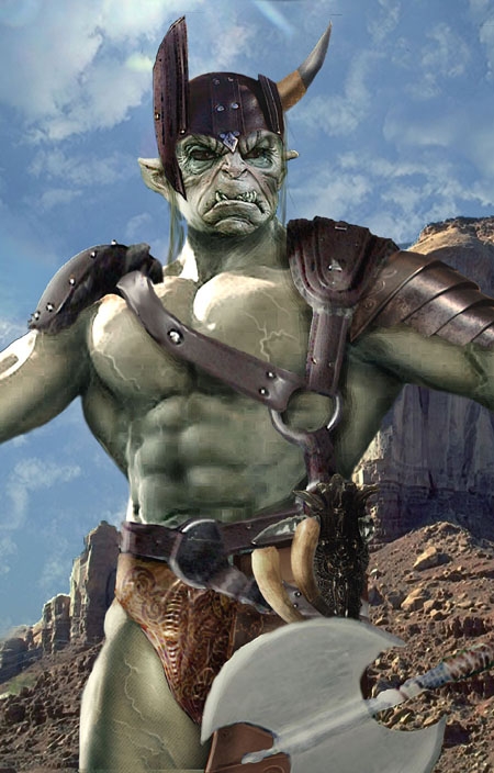 Thorgh was created from an orc mask, and the body of a bodybuilder (I used earlier on my mul picture). Armour created from several pictures, added background, lighting, weapon etc. Thorgh is probably more orcish looking than anything else, but he is not stupid or dumb. I would say his intelligence is quite above average for an orc, and his charisma quite low.