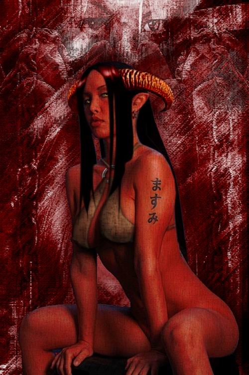 Hi, ive been looking arround at alot of portraits...im becoming very interesting in seeing if i can make one. yours seems to be the one i can figure out the most. but i have a question or two lol. how did you get the horns? did you have another pic and just cut them out? also did you add another effect (other than the "scratched effect" to make her a little less human looking? its a beautiful portrait by the way ^_^