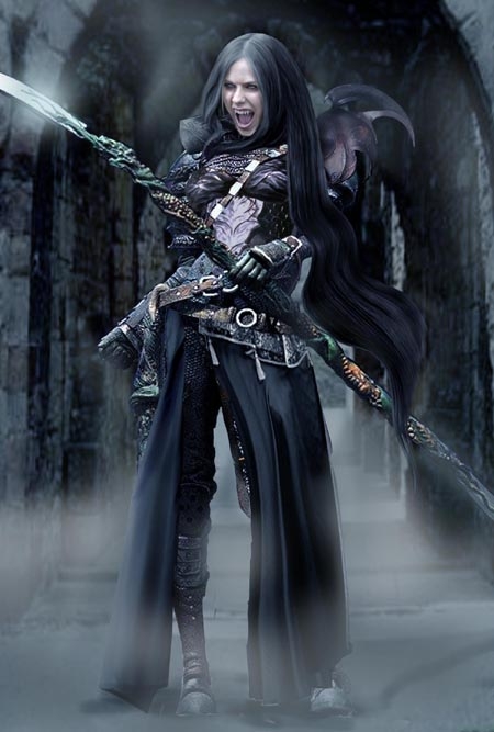 I wanted to do a vampire for ages but never got the right picture or idea for a portrait. Until I found a simple picture of the slightly annoying, but quite useful for this portrait; Avril Lavigne. The body was constructed from a base picture of a Ultima Online action figure. Clothing and armour pieces added, lighting and atmospheric effects + background added.