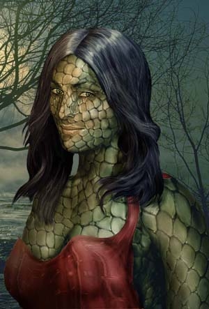 I had a yuan-ti female on my list of pics to do for ages, and here she is finally. The skin was murder! I had this small picture of snakeskin and I had to create a texture for the whole body. In the end I feel it's turned out pretty well. I have used a celebrity as base image and I am curious if anyone will recognize her underneath all those scales. Added background, lighting effects, recolouring, the usual deal, but I kept it all quite simple.