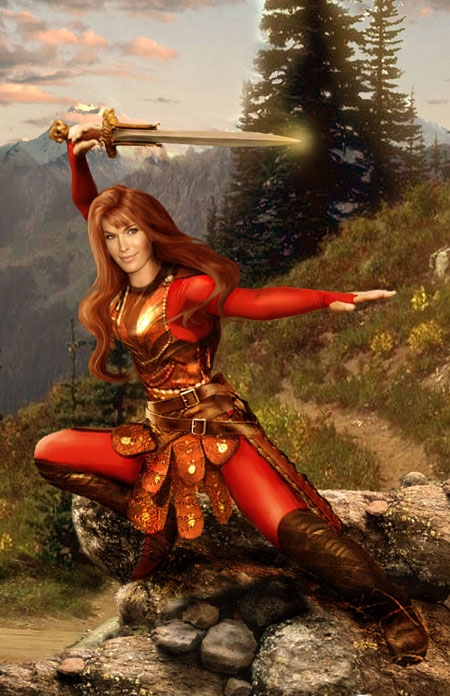 I like it but not as good as some of your other work. IHMO, the sword looks like the end has broken off, it looks like it should be longer. Also her hair at the end, near her breast was over done with the liquid tool. It's too bendy. She also looks too "pretty" (super model vs fighter!). I really like your other work better, but having said that, this is way better than anything I could ever do.