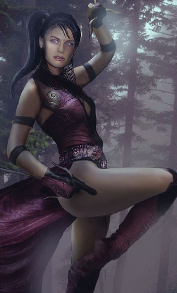 Lizehjia is the long time enemy of Jarath, my female samurai apprentice. Lizehjia is not a very nice woman, balancing on the edge of insanity. Created from a unknown model body posed like this and the head of a celeb, she had a couple of knives which I liked and the pose I thought is cool. Photo-collage, added several textures and pieces of clothing to alter outfit,lighting effects and background added.