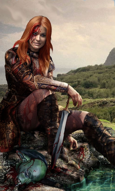 Saemy is resting by a pond to wash off the blood after a brutal fight with a goblin. Created from (yes once again) a base image of Xena, head model is a celebrity but I have no idea who anymore. I tried to alter her features anyhoo so I hope noone recognizes her. Added rocks and background, water was created, I also added the goblin head (from a pic of someone playing LARP as a goblin, sorry I cut off your head :))