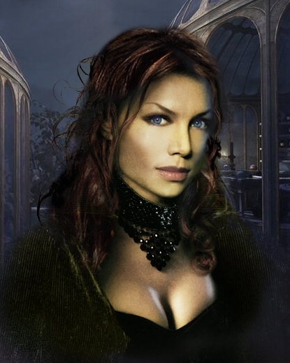 Selenna is a dark beauty. Her wavy auburn hair complements her blue eyes and her other facial traits, softening her beautiful yet cold appearance. She is a mysterious and soft-spoken temptress, using body language, faint smiles and her eyes to lure and seduce, but she is also a powerful mage. As a portrait, I feel it could be used for a human or maybe half-elven female, probably magic-wielding.