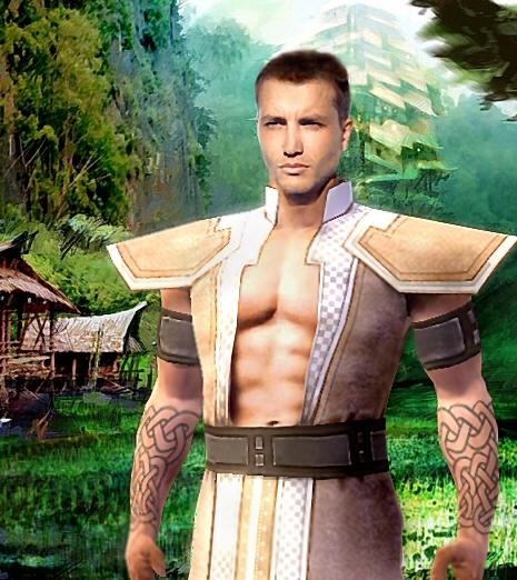 Kian's views on life come mainly from his monk order. Living secluded in the mountain forests, they have spent most their lives learning fighting techniques and practicing meditation. Kian's own skills are far greater than many others, and although his gaze seems fiery, his mins is usually travelling past what he sees and hears. This 'deep' nature of his is why his charisma suffers, despite the very good looks he posesses. This is yet another attempt on my part to create a male portrait that features a very good looking man and as much skin as possible. :P