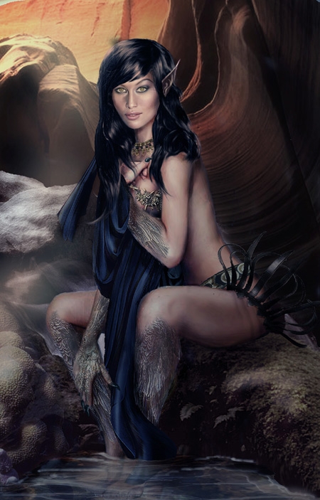 A very complicated photo-collage this time. I was aiming for a picture of a succubus similar to the one in NWN. I found a picture of a girl sitting on a sort of sculpture as base image. The head model is Laetitia Casta. I added hair, piece of cloth, textures. The cave was designed of several pieces of nature, background and lighting effects. I spent ages trying to get a different lighting from above her. I also tried to give the whole a painted feel be recolouring skin and trying different brushes in Photoshop. I am really happy with this picture, any comments are welcome.