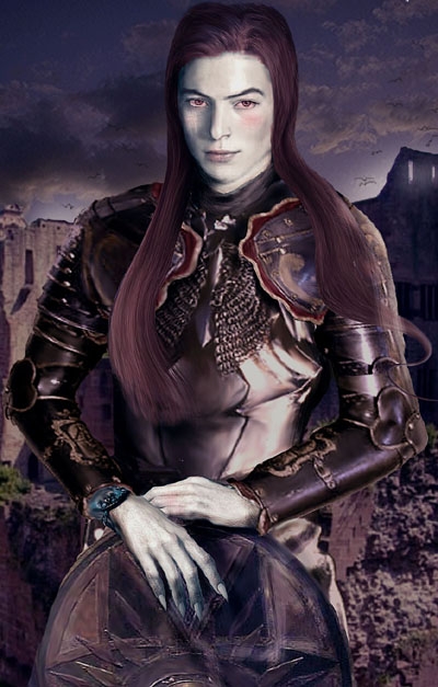 I uploaded this one earlier, but it never came through, somehow :D Well here it is, created from a male model from models.com, added textures, armour pieces, shield, hair background. The usual stuff. Update: made the hair a little flatter.