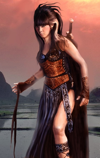 She comes from the east, travelling like a wraith by sunset only. Created from head model from models.com, body borrow from Xena. More or less reworked original outfit, recoloured area's, and smudged lower part of clothing to create skirt.