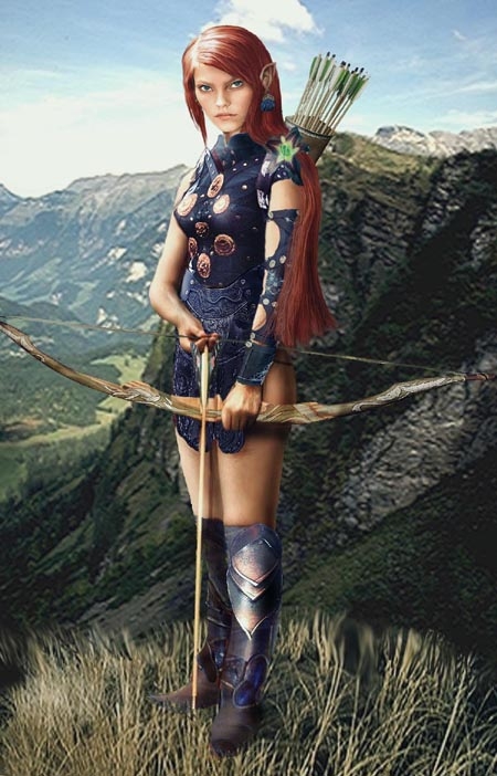Created from a girl posed as an elf. I myself added a new head, hair, costume and changed bow. Background pieced together. Comments always welcome. Here is a tutorial on how I created her: http://nwvault.ign.com/Files/other/data/1099994366000.shtml
