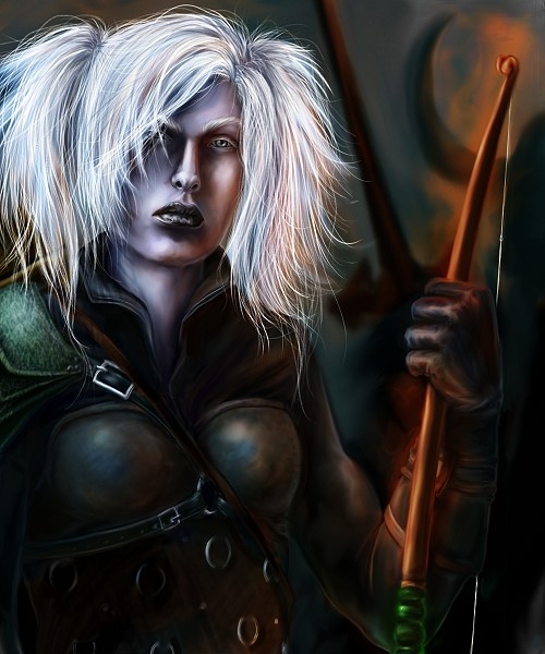 On the character: I normally hate the standard rules on how to make races,etc. But in this case I would have to say she could be a tad darker. Drow are after all dark elves, and she looks more grey now.