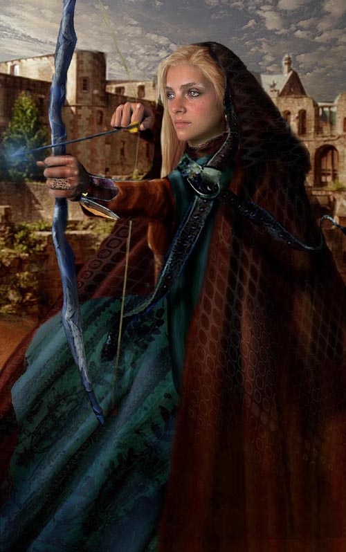 Darjahn is a warrior in disguise, always riding her horse like a noblewoman through the city on the look-out for evil. She was born of several nameless models. I've spend a lot of time on getting the entire picture right, and somehow during the making the idea grew of her riding a horse. The horse is not actually visible but I like the impression of it. I used quite a lot of pictures in this one, tried to use some textures and different cloths together. Let me know what you think of this one. Update: Mr_Dave made me aware of a rather silly mistake. The arrow is now on the other side of the bow.