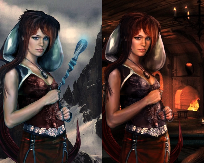 Xiandrie was constructed from an originally quite blurry and pixelated image. I cleaned her up, added some new clothes, reworked the hair and skin, added background. I have added two versions here, one in the cold mountains, and one in a warm inn. Different setting, different lightings, the inn version has no staff.
