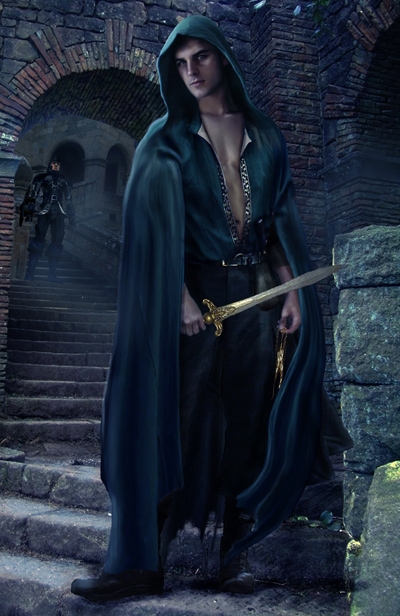 Hey Phaere. This is a really great pic. Love the atmosphere and lighting. I think the comment on the sword is valid but all you have to do is flip the blade. The long curved edge on the top of the blade should be on the bottom that's all. If you redo the sword you may want to push it down a bit too so that his hand rests against the hilt instead of that round part on the handle. Otherwise great job!