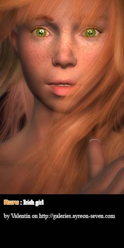 | Title | Irish Girl | | Author | mlatreille | | Submitted / Updated | 05-03-2006 / 05-03-2006 | | Category | Human | | Gender | Female | | Format | rar | | Description | Une image qui n'est pas de moi mais dont vous trouverez la source ici : http://galeries.ayreon-seven.com/