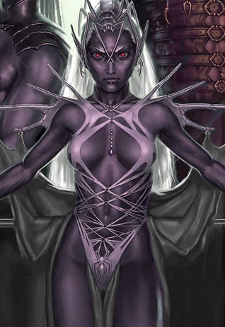 Downright frightening image. Many of the submitted drow female portraits have a "soft and sexy" look, you have one here that, while still sexy, she's got a cold, calculating glower to her. Very nice work.