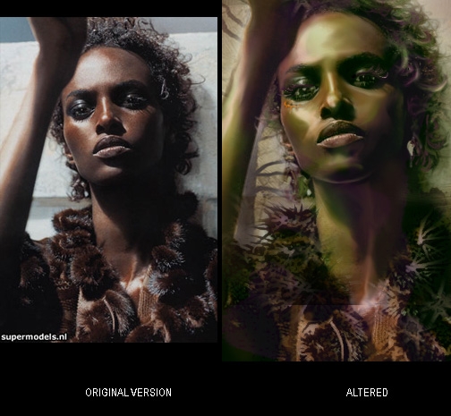 A dark-skinned, African woman who looks tough and serious. This could be used for almost any class, but the race is probably human. This is another portrait I made in response to the lack of variety for people who don't always want to play a white character. The photograph that I altered is a picture of the supermodel Yasmin Warsame. Please leave a comment if you like it or have any constructive criticism for me!