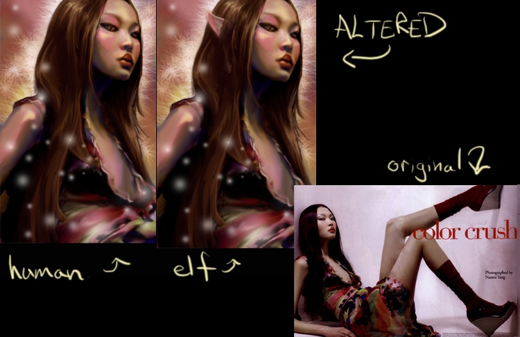 A woman with east Asian features and a proud and delicate look. There are two sets of portraits for elf & human versions. The photograph is taken by Naomi Yang, and the model is Eugenia Mandzhievai; picture appeared in Vogue Taiwan. I appreciate it if you leave a comment/vote if you like it or have any constructive criticism.