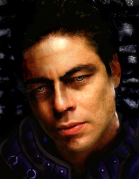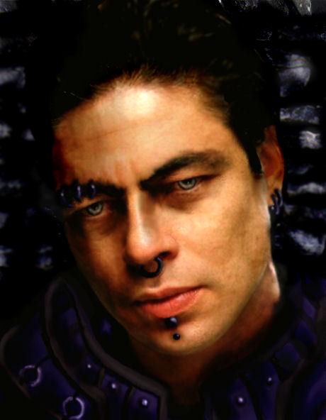 I like the version without piercings much bettern, and Benicio has such a great face for a rogue! I think the face and background look a little disparate, though.