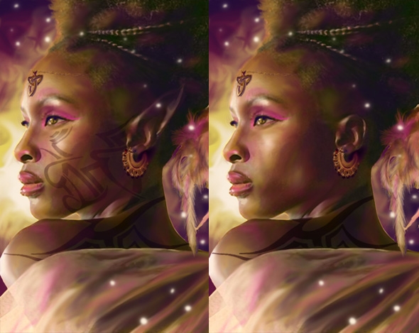 A brown-skinned woman (both elf and human version) who looks very mystical and regal. The elf version was made with wild elves in mind, thus the tattoos. I kept 1 tattoo on the human version because it seemed to compliment the softness of the picture nicely. The photo that I used is a picture of the model Dji Dieng, painted over with jewelry added in. I'm really happy with how this one turned out! Please leave me a comment, vote, and tell me what you think!
