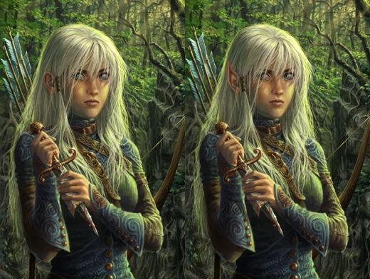 The original portrait bothered me a bit. I thought the ear was a little small and dark, so it was visually distracting. I also thought it should be elven in appearance. So I redrew the ear in Photoshop (first time to do that kind of work, and it turned out well) and adjusted the contrast.