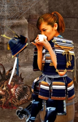 Love portraits that take a moment in time, the realities of adventuring that we rarely consider, the contradictions of people. So I couldn't resist this photo for a paintover, composite with photos of armor, katana, barrel, other graphics for beholder, background, web.