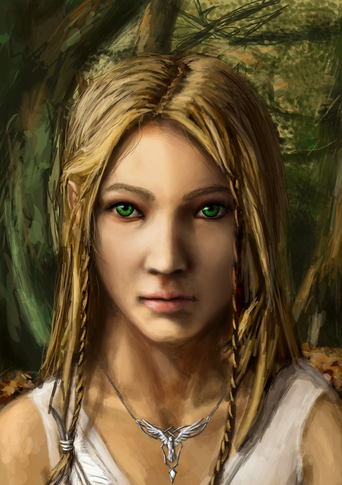 She is a digital painting, done without any direct reference, though since she is the younger sister of a character who was created about gyrfalconthegrey's Delainy portrait, I referred to that to create a family resemblance.