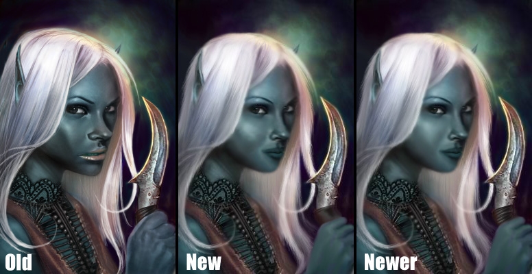Not sure I like the softer cheekbones -- high, well-defined cheekbones are one of the things that give elves their "timeless" look. And when it comes to Nathyrra's first appearance, I think something more dangerous-looking and less "young and cute" is more fitting.