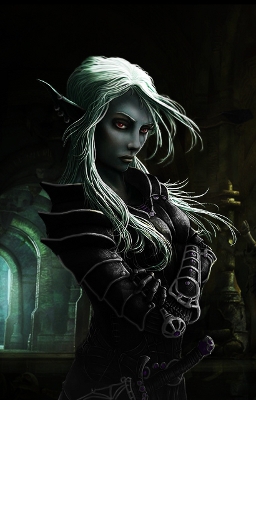 A picture of a drow female on a rather gloomy background. Made for a Drow Bard/Fighter wearing heavy armor and shield.