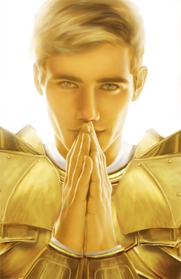 The guy is painted over a black and white stock photo base. Armor is a collage of bits and pieces from different plate armors, -then painted gold.