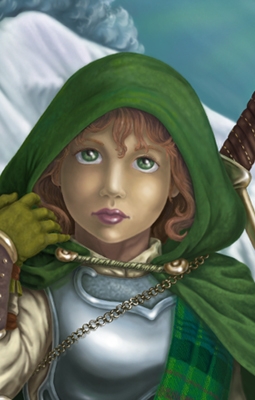 Bodangly, this is an entirely original work. taken from a scanned pencil drawing (by myself, of course), that I painted over in Photoshop 6. I did have some objects as guides. The tartan sash is based of the pattern of a Black Watch tartan beret coin purse while the chain holding her sword sheath in place is based on the style of a belt around the waist of a collectable doll I have. (The color, lighting and placement are totally different.) And finally, the background scene is very loosely based on a photograph of the Alps. However, I added the clouds and painted the the mountains to look like an ice wall in the near distance instead of mountains in the far distance.