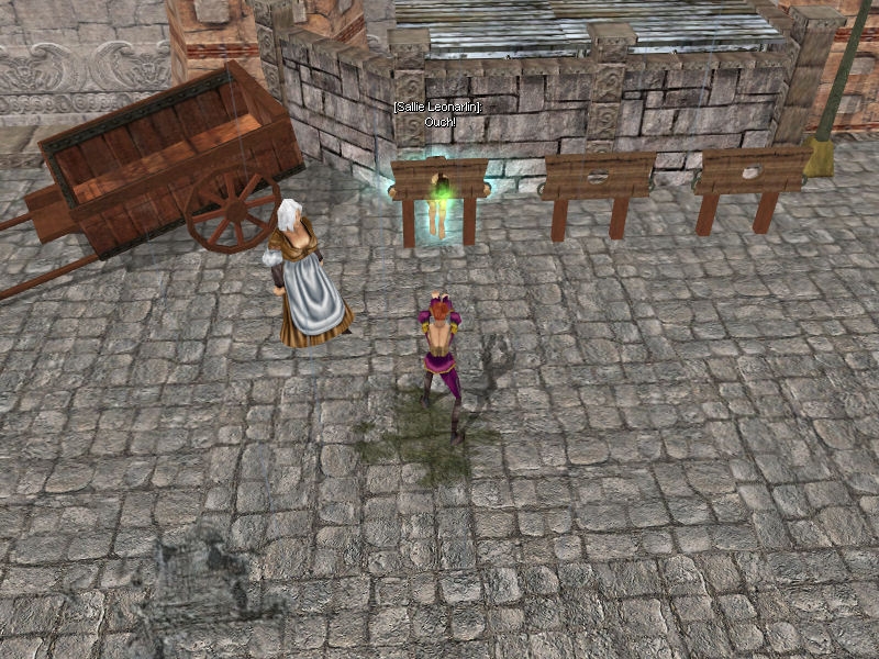 The DM's Wand of Retribution will enable the DM to send players to the stocks for a set period. This can be used to punish Griefers or can be used IC for infractions of you PW's laws. When you use the wand the player is transported to the stockade and paralyzed. They are made invisible and hidden. The Empty stocks then change to occupied stocks with the player's name attached. A Shout is sent out stating that they have been sent to the stockade and that other players can buy rotten fruit from the two vendors and pelt the offender. The offender is dealt 1HP damage every time the rotten fruit hits. They will remain in the stocks until they have lost half their hitpoints. Higher Level offenders will thus automatically be in there longer.