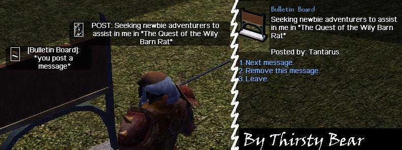 The Bulletin Board allows characters to leave messages for each other in-game. Useful messages could be requests for party members or items for sale. It would be most useful in persistant world settings where the players may not know each other and SHOUTing to all characters might be rude.