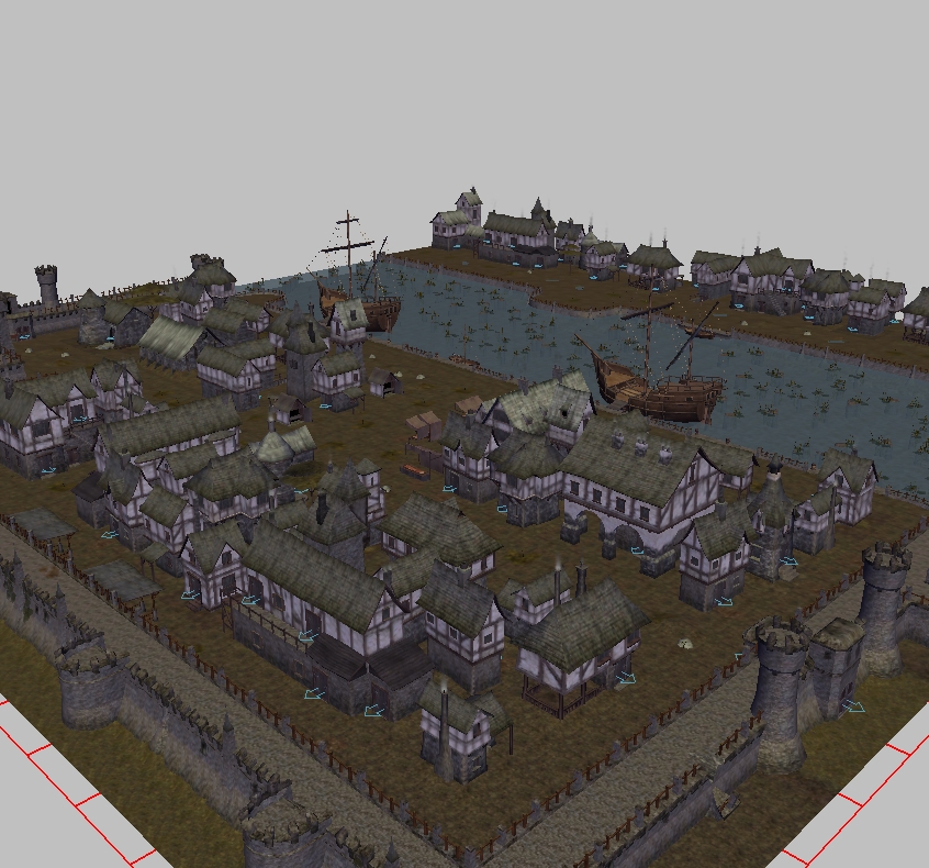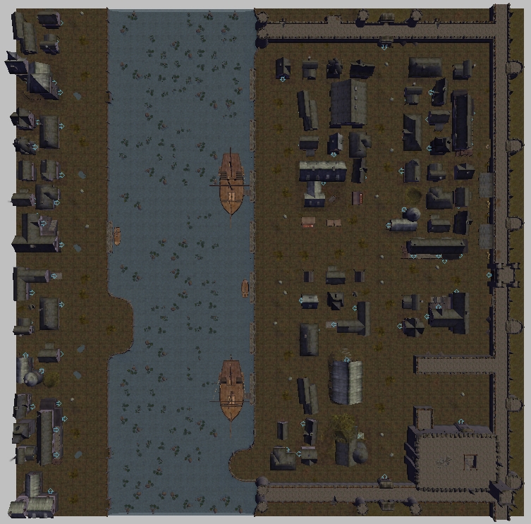 It has lots of houses, chappel, smithy, castle, two inns and a marketplace. Also has prop houses in the unaccesable side of the river and has walls in north and south ends of the area, making unexistant residental areas unaccesable.