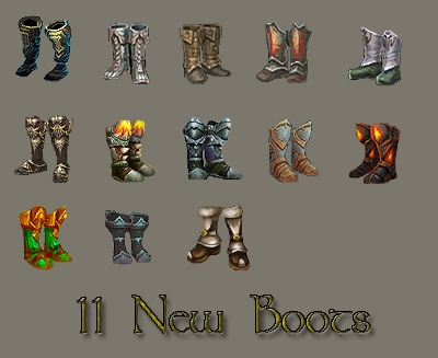 | Title | 13 New Boot Icons | | Author | Revenant Team | | Submitted / Updated | 10-05-2011 / 10-06-2011 | | Category | Items | | Type | Boots | | Description | | 13 New boot icons. I know the current offerings are parts based, but really who isn't tired of looking at the same offerings? |  |