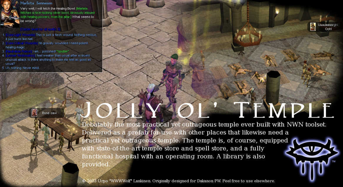 A detailed temple of a good deity, with a store that sells healing magic, including spells. Also includes some scripted ambient activity, such as a practicing monk and a busy hospital area with an operating room. More or less ready to insert to a module, though it is recommended to customize the dialogs.