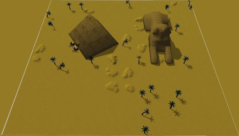 There are 3 areas in this zipfile, 2 areas linked w/transition (one is exterior desert with Pyramid and Sphinx), 2nd is the Pyramid entrance, and 3rd is BONUS flat desert area without trees for starter point.
