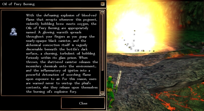 I was surprised how amazingly easy this was to implement in Neverwinter Nights. This ERF contains the 'Oils of Fiery Burning' that've been being used since the earliest edition of D&D, and is taken straight from the DMG�s description for the Burning Oil�s explosive effect. It�s balanced, and doesn�t even require a single modified game resource. I decided to use the Holy Water appearance for the oil�s icon, as I disliked the Alchemist�s Fire appearance (mostly because Burning Oils detonate instantly when exposed to air, and the trail of fire poking from the Alchemist�s fire made it look unrealistic. But that�s just a nitpick). Anyway, enjoy!