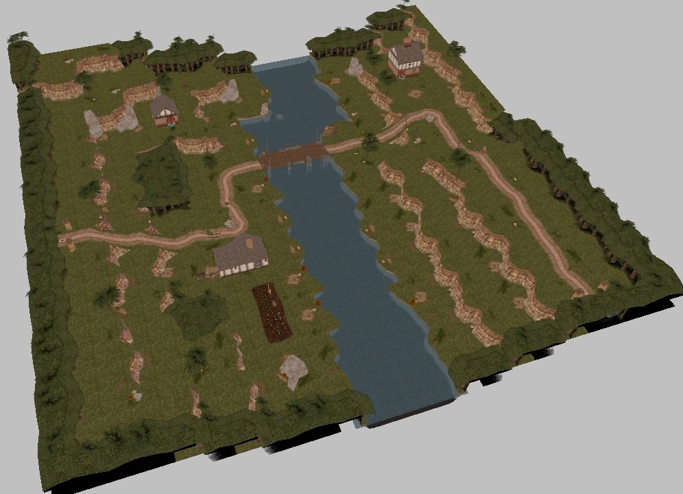 Built something like this for our mod. Liked it enough that I made something close to it for here. Has three homes and 2 covered entrance/exits. Something for a quick easy import to your mod. Hope it helps. If you have any map building needs. Let me know. I will try to help. Have a brain full of ideas.