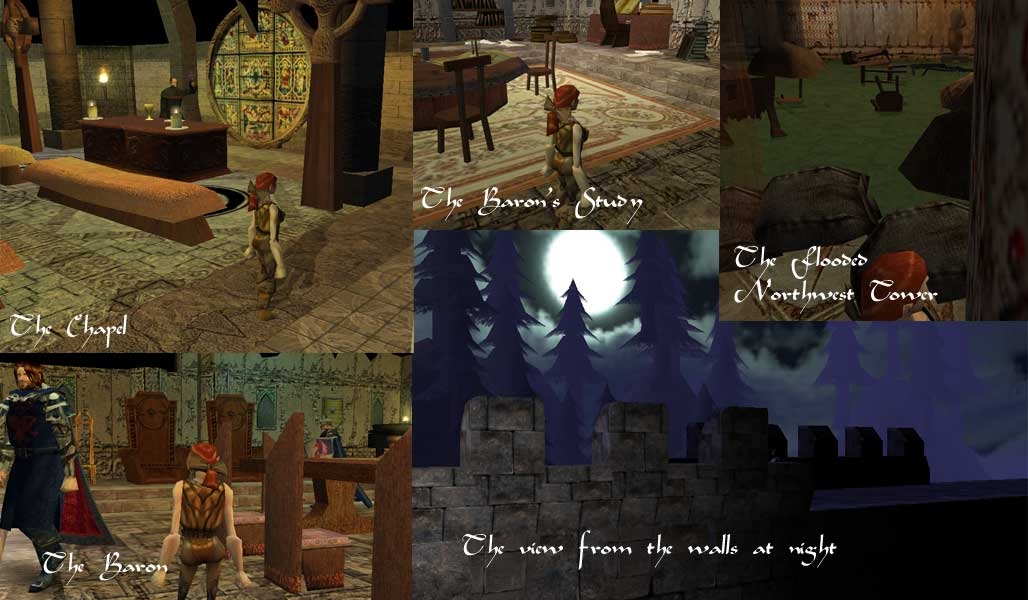 After spending over a year dabbling in module creation (and only actually finishing one module), I discovered that I'm better at creating *settings* than actual adventures. The Castle of Baron Brordenelle is the first of (hopefully) several places that will inspire others to create adventures. An old castle, little used until recently, it is hidden in a wooded valley. The prefab includes grounds, walls, a chapel, and a multi-storied hall. All necessary NPCs are included as well, with enough scripting to have them move belieavably around the area. You could easily customize this area into a PW or a module, or it could be used as a starting place for several adventures. Feel free to do with it as you will. All I ask is that: 1) if you use it somewhere, send me a link so I can see what you did, and 2) if you use it, credit me somehow. See the readme file for more information.