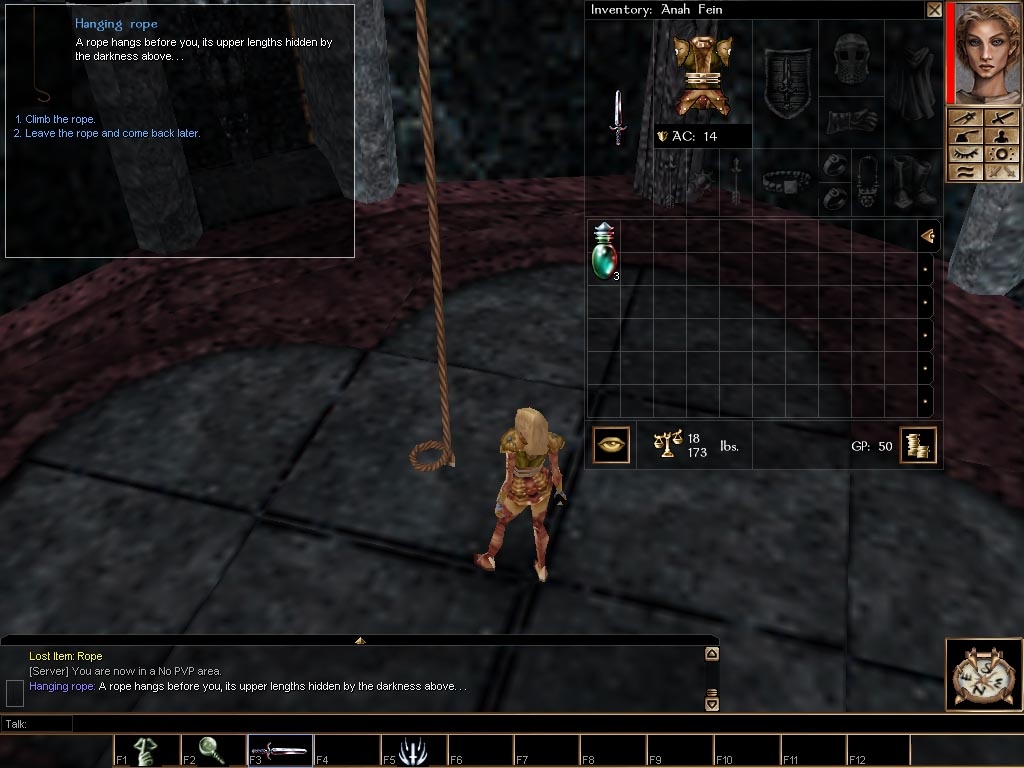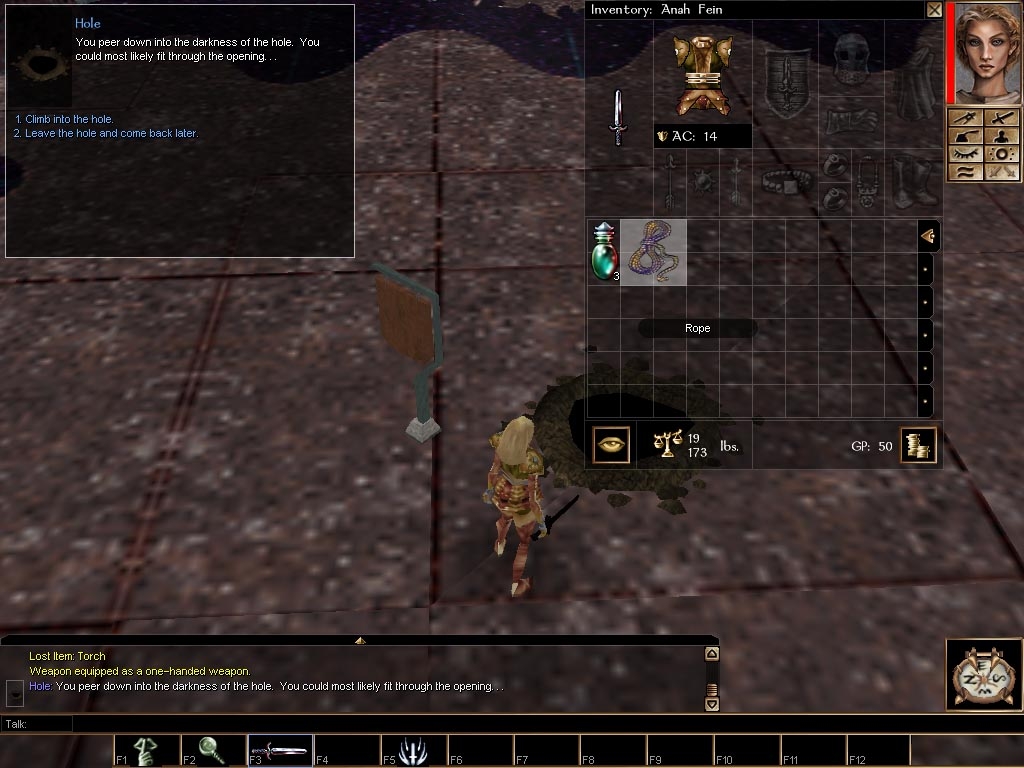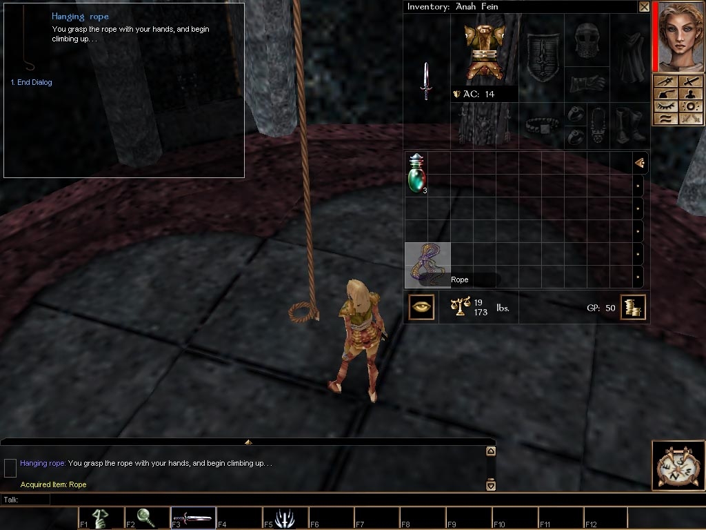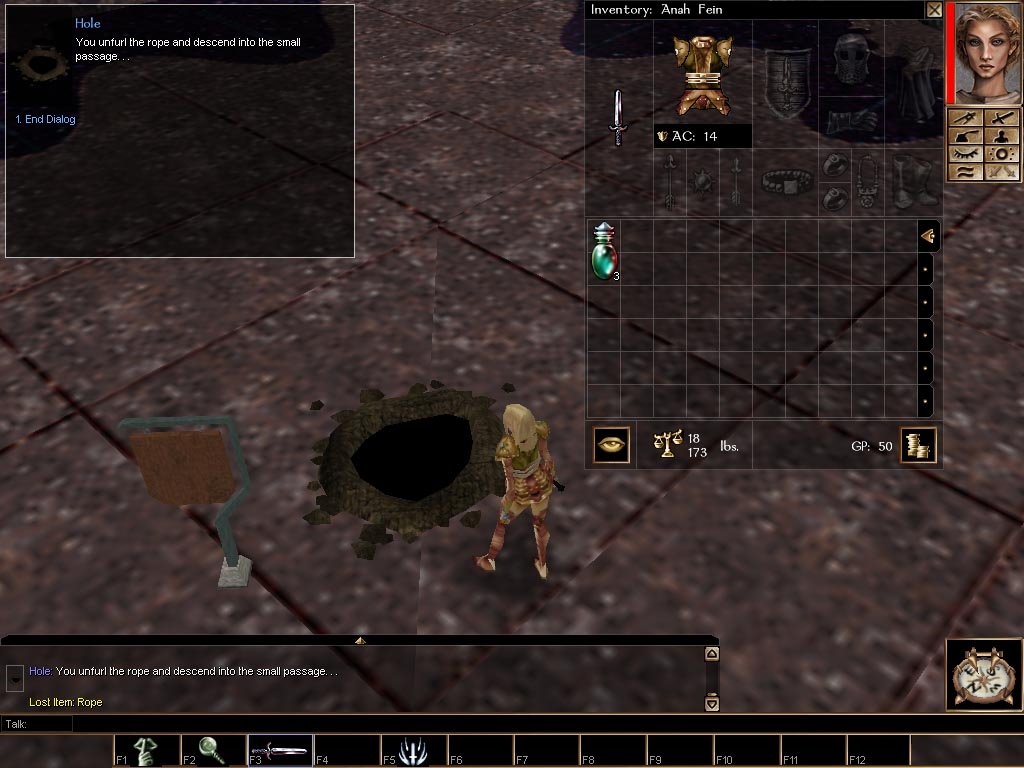 The HaRS was developed in response to my modules' need for more "depth" and a little bit of "realism". While working on my first [and as of yet, unreleased] module, I couldn't find any discussion-board information concerning a hole-and-rope movement mechanism. As a result, I developed the HaRS package, which I am now submitting to the NwN community. The Hole and Rope Set adds a functional and flashy element to a module. It utilizes conversation-based scripts to create the illusion that the PC is using a rope for movement; the actual movement mechanism is guided by waypoints. The package is relatively simple to install, and provides the PC with another level of gameplay immersion.