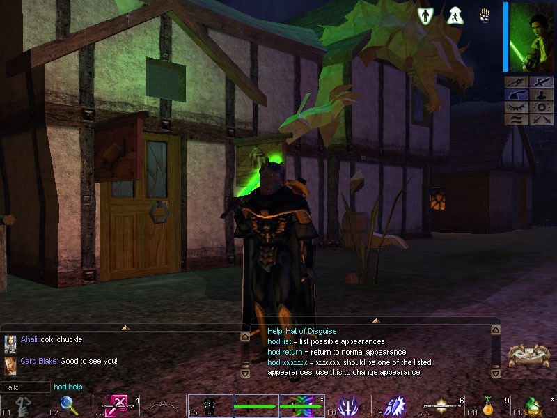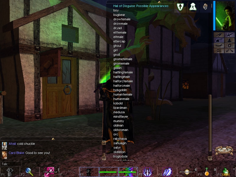 With the release of the 1.69 patch for NWN came the built-in ability to grab information from the chat bar via the OnPlayerChat event and scripts. I've updated the Hat of Disguise to take advantage of this to reduce the number of scripts needed while expanding on the both the number of forms available and the ease of use of the item (since it no longer needs to be "activated", using up a round, then more time finding the right appearance in a conversation).